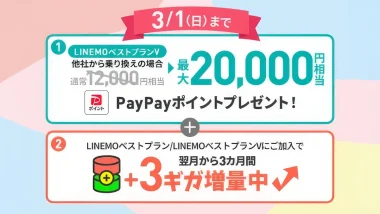 LINEMO、最大2万円相当もらえるPayPay増額キャンペーンと3ヶ月間データ増量キャンペーン開始!3月1日まで【LINEMO週穫祭】