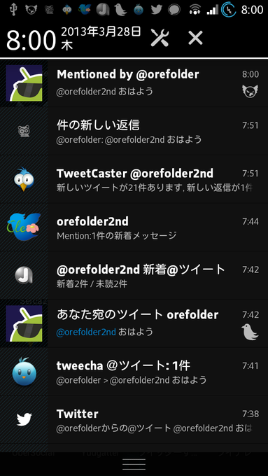で、特に設定はいじってなかったのですが、デフォルトで通知がオンになっているアプリも多いようで、テストでリプライとかやってたらこうなりました、というのが次の画像。