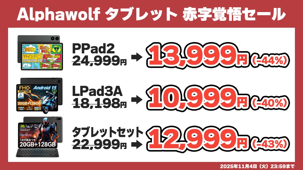 Amazon似て、Alphawolfのタブレットがセール価格になっています。対象となるのは3機種で、PPad2が44%オフの13,999円、LPad3Aが40%オフの10,999円、タブレットセットが43%オフの12,999円です。