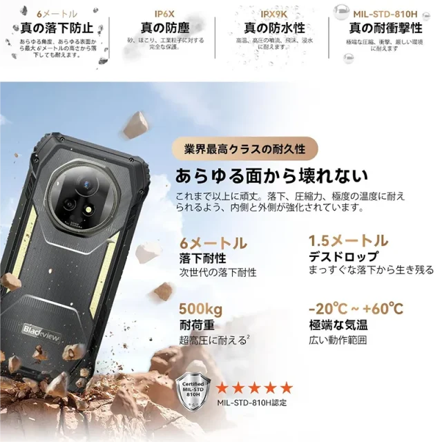 Blackview XPLORE 2はIP68 & IP69K & MIL-STD-810Hの頑丈なタフネススマホです。防水・防塵はもちろんのこと、6メートルからの落下や500kgの耐荷重、-20℃~60℃までの気温に対応など、あらゆる面での耐久性があります。