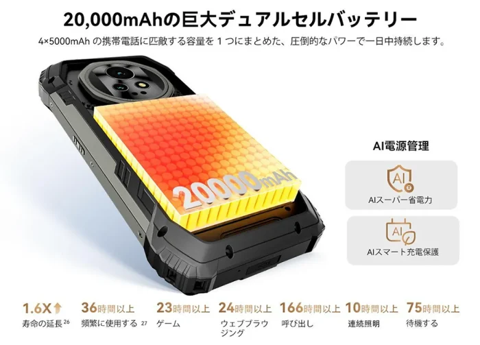 Blackview XPLORE 2のバッテリーは20,000mAhの大容量です。普通のスマホは5000mAhくらいで、6000mAhあれば大容量といったところ、Blackview XPLORE 2は20,000mAhです。普通のスマホの4倍くらいはまさに圧倒的。まぁその分、厚みは29mmもあるのですが…。