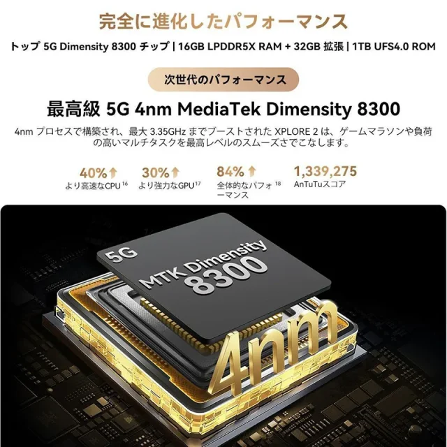 SoCにはMediaTek Dimensity 8300を搭載します。AnTuTuのv10系では約134万点、v11系では約160万点となるようです。タフネススマホというと、性能としてはミドルレンジかそれ以下のイメージがありますが、これならミドルハイかそれ以上の性能を期待できます。