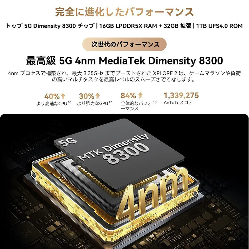 Blackview XPLORE 2はIP68 & IP69K & MIL-STD-810Hと耐久性のあるタフネススマホです。SoCにDimensity 8300を搭載しRAMとストレージは12GB+256GBと16GB+1TBの2種類。バッテリーは20000mAhの超大容量で120Wの急速充電に対応します。ディスプレイは6.73インチ 3.2K AMOLEDディスプレイでリフレッシュレートは120Hz対応。タフネススマホでも性能はバッチリです。