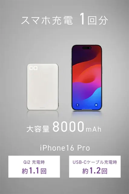 容量8000mAhはだいたいスマホ1回分です。5000mAhだと足りるか不安、10000mAhだと十分でも重くなりがち、というなかで「ちょうどいい」バランスが8000mAhです。