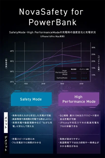 SMARTCOBY SLIM II Wireless 2.0 8Kは「High Performance Mode」と「Safety Mode」の2つのモードがあります。充電速度を上げるとより発熱するようになるので「熱くなっても急速充電」「発熱を抑えた充電」どちらも選べる、切り替えられる仕様です。