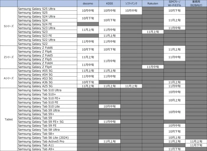 One UI 8対象機種、ソフトウェアアップデート時期 (10月9日時点予定)