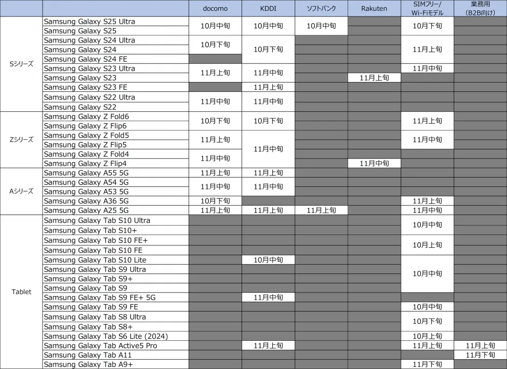 One UI 8対象機種、ソフトウェアアップデート時期 (10月9日時点予定)