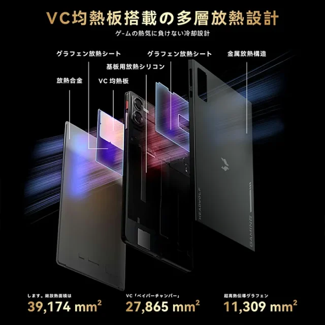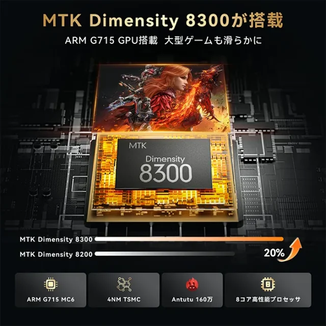 Headwolf Titan1はSoCにDimensity 8300を搭載します。これはAnTuTuのv10系では約140万点、v11系では約160万点となるようです。これまでのHeadwolfにはなかった高性能機であり、ゲーミングタブレットと名乗るだけあります。