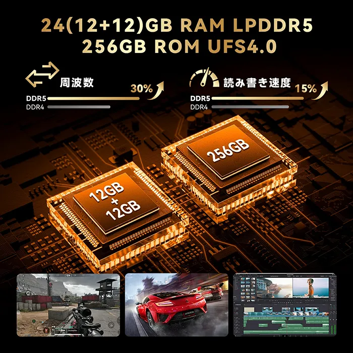RAMは12GBでストレージからの転用をあわせて24GB相当になります。ストレージは256GBで最大2TBのMicroSDカードにも対応するようです。