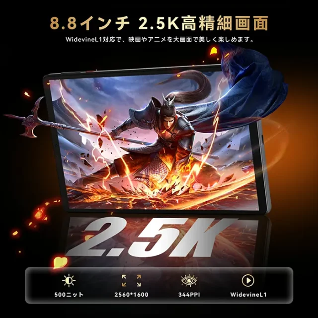 Headwolf Titan1のディスプレイは8.8インチと、タブレットとしてはコンパクトサイズです。それでいながら解像度は2560×1600(2.5K)と高精細です。さらにリフレッシュレートは144Hzに対応します。