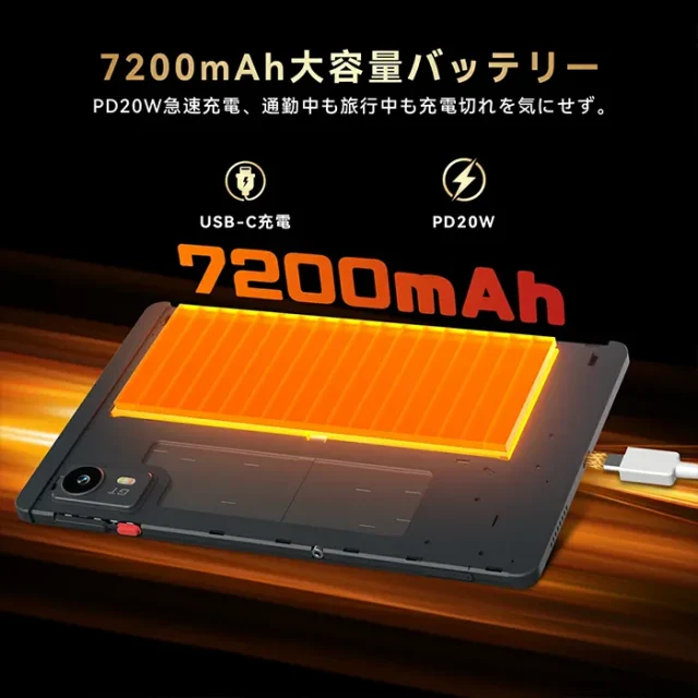 バッテリーは7200mAhと大容量。充電はPDの20Wに対応します。めちゃくちゃ早いわけではありませんが、十分でしょう。また、ゲーミングタブレットらしく冷却システムもあります。ちなみに暑さは7.9mmで比較的スリム、重さは325gとなっています。