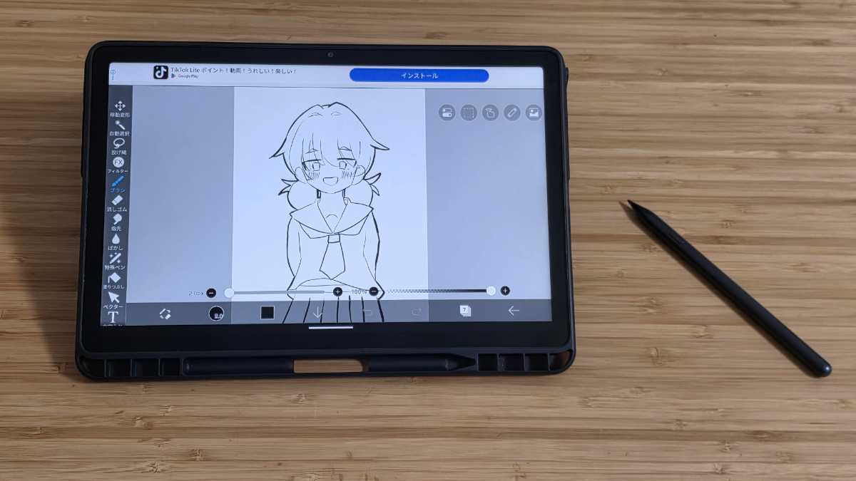 なんだか液タブとしての趣旨から脱線してしまいましたが「持ち運べる液タブ」としても十分です。紙に近い描き心地で、4,096段階の筆圧検知にも対応するため、イラストはもちろん、デザインの作成にも使えてしまいます。ただ、ペンの遅延?は少し気になりましたが許容範囲内です。