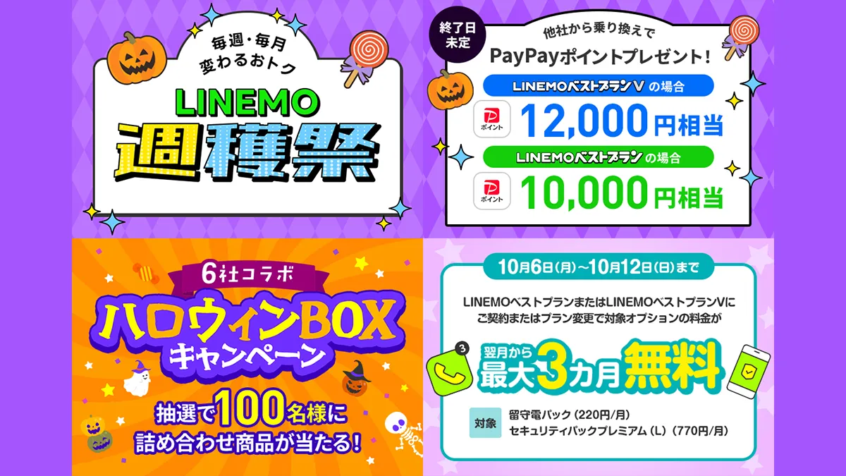 LINEMO特典、10月は6社コラボのハロウィンBOX!10月第1週は留守電パック+セキュリティパックプレミアム(L)が3ヶ月無料!【LINEMO週穫祭】