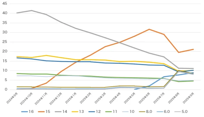 2024年9月から2025年9月のそれぞれのシェアを線グラフにすると上図の通り。先月級に増えたAndroid 8.0とAndroid 5.0は今回で下がりました。…が、急激に落ちたわけでもなくまだかなり残っています。おかしなデータが9月も続いていたのか、本当になんらかで割合が増えていたのか…謎ですね。