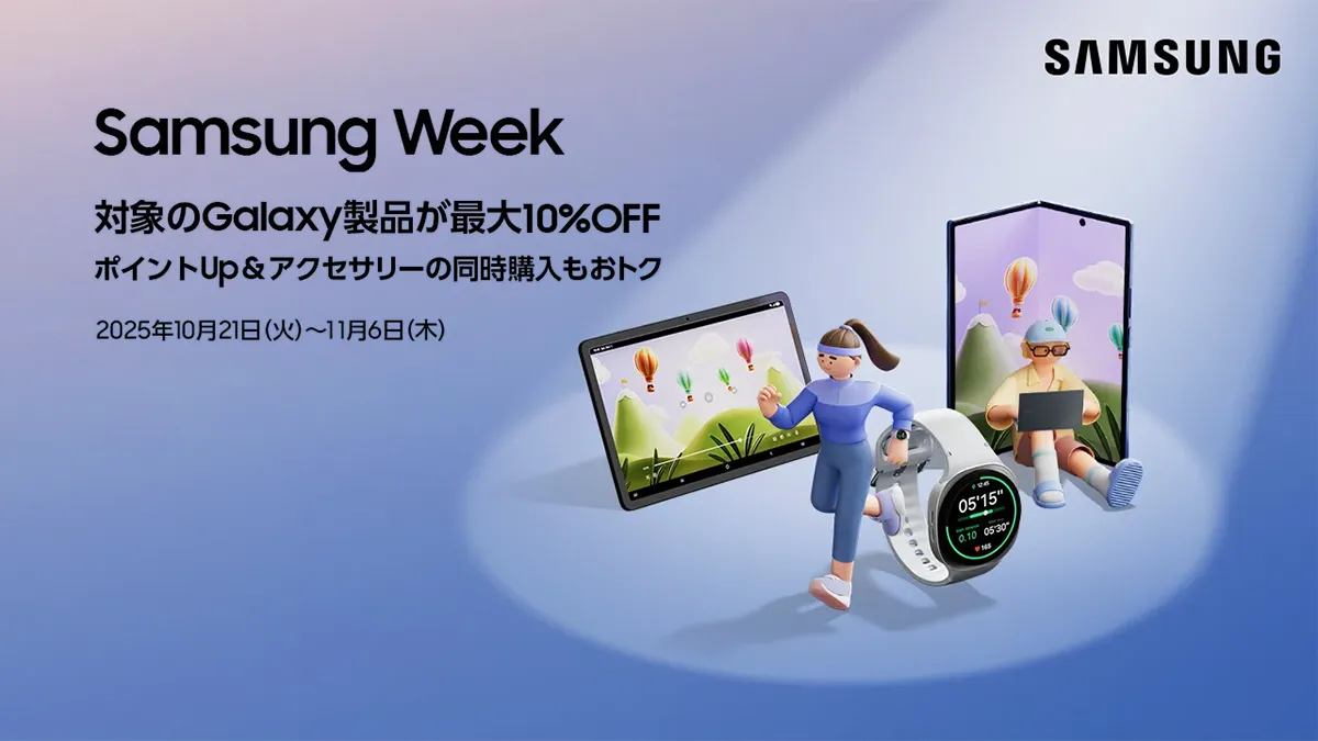 サムスン電子ジャパンは10月21日より、公式サイト「Samsungオンラインショップ」にて、Galaxy Z Fold7が10%オフなど対象製品をオトクに購入できる「Samsung Week」を開始しました。開催期間は2025年10月21日 10:00~11月6日 9:59です。