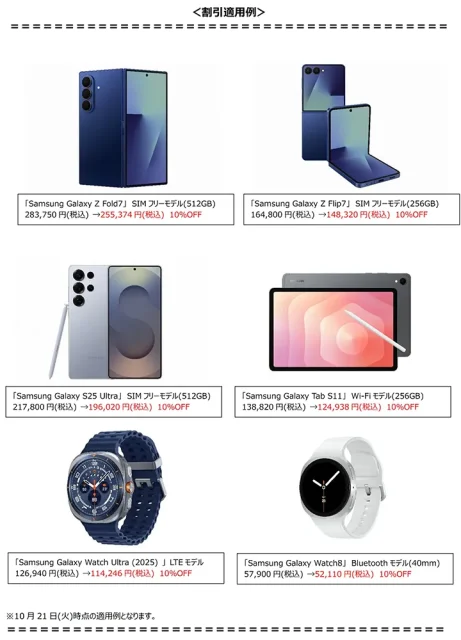 サムスン電子ジャパンは10月21日より、公式サイト「Samsungオンラインショップ」にて、Galaxy Z Fold7が10%オフなど対象製品をオトクに購入できる「Samsung Week」を開始しました。開催期間は2025年10月21日 10:00~11月6日 9:59です。