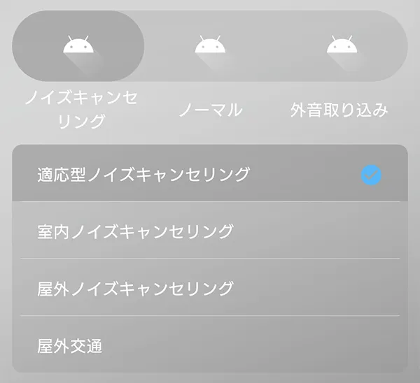 ノイズキャンセリングは「室内」「屋外」「屋外交通」のほか「適応型」が選べます。これは周囲の雑音や装着状態、耳の形状に応じてノイズキャンセリング効果を自動調整するというものです。