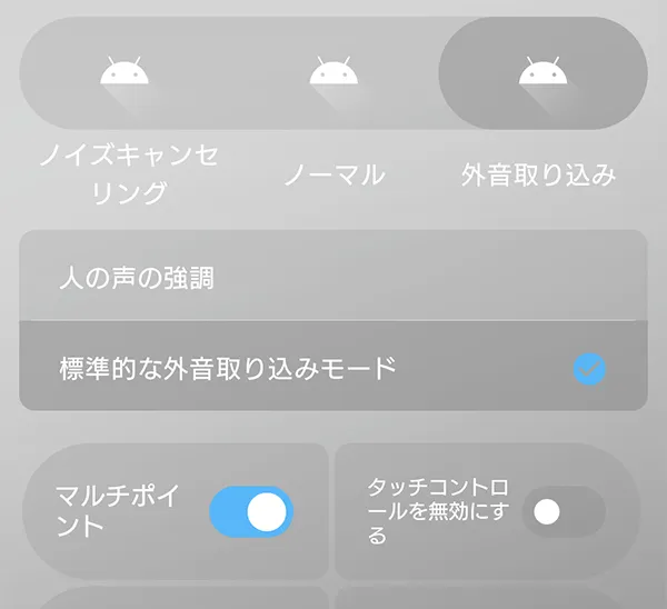 また、外音取込についても「標準的」のほかに「人の声を強調」が選べます。自分の使い方に合わせて選べますね。