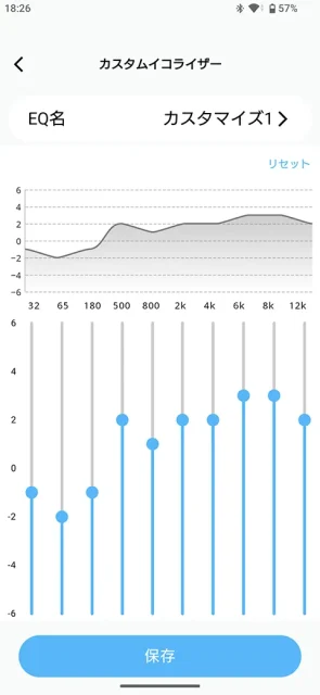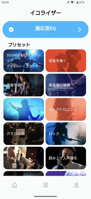 イコライザーで音を調整できます。12種類のプリセットのほか、自分でカスタマイズも可能です。また「適応型EQ」という、聴力テストを行って調整するモードもあります。