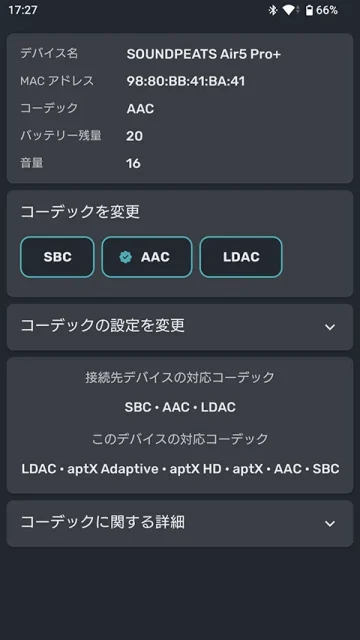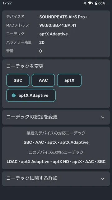コーデックはSBCとAACのほかaptX, aptX Adaptive(aptX Lossless)に対応します。アプリでLDACをオンにするとaptXは消えます。