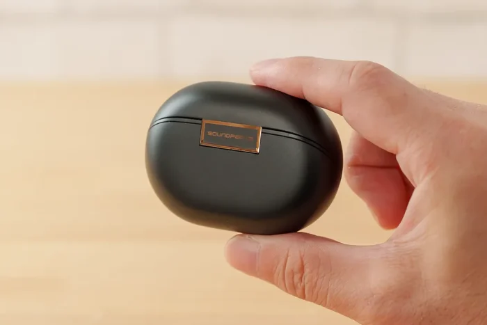 ケースはつや消しで落ち着いた黒。高級感とまではいかないかもしれませんが、安っぽさはまったくありません。背面側にSOUNDPEARTSロゴのプレートが配置されています。