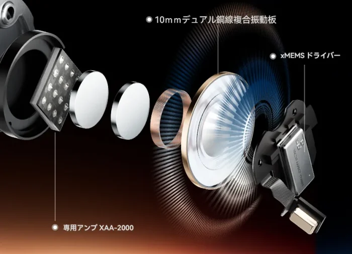 | ドライバー | xMEMS Labs製「Cowell」MEMSドライバー + 10mmダイナミックドライバー (デュアル銅線 PU+PEEK素材複合振動板) |