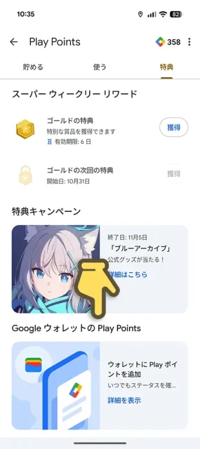 私はPlay Pointsのウィークリーリワードのためにこのページを表示したのでここから追加しましたが、普通にGoogleウォレットアプリからポイントカードの追加でも行けると思います。