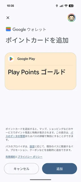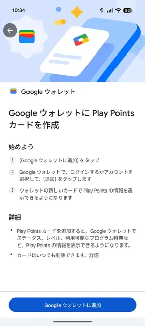 あとは案内に従ってボタンをタップすればGoogleウォレットにPlay Pointsのカードが追加されます。
