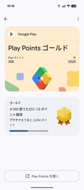 Play Pointsのカードを確認すると、Googleウォレット上でステータスやレベル、ポイント履歴などが確認できます。