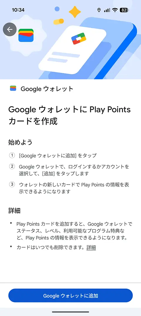 あとは案内に従ってボタンをタップすればGoogleウォレットにPlay Pointsのカードが追加されます。