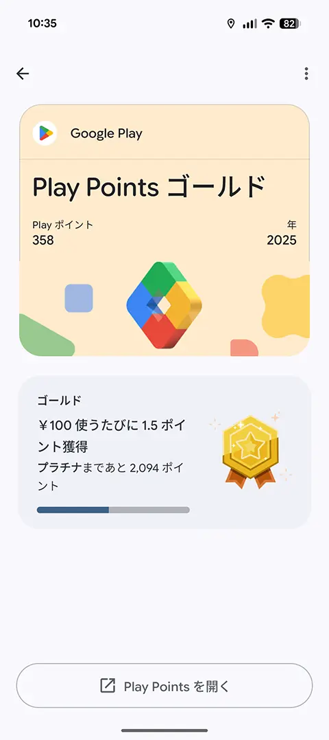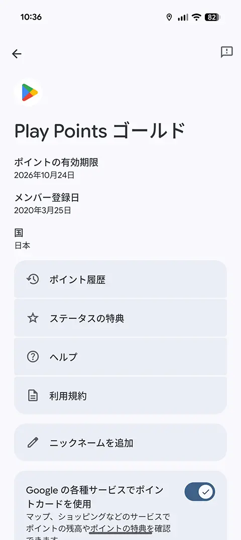 Play Pointsのカードを確認すると、Googleウォレット上でステータスやレベル、ポイント履歴などが確認できます。