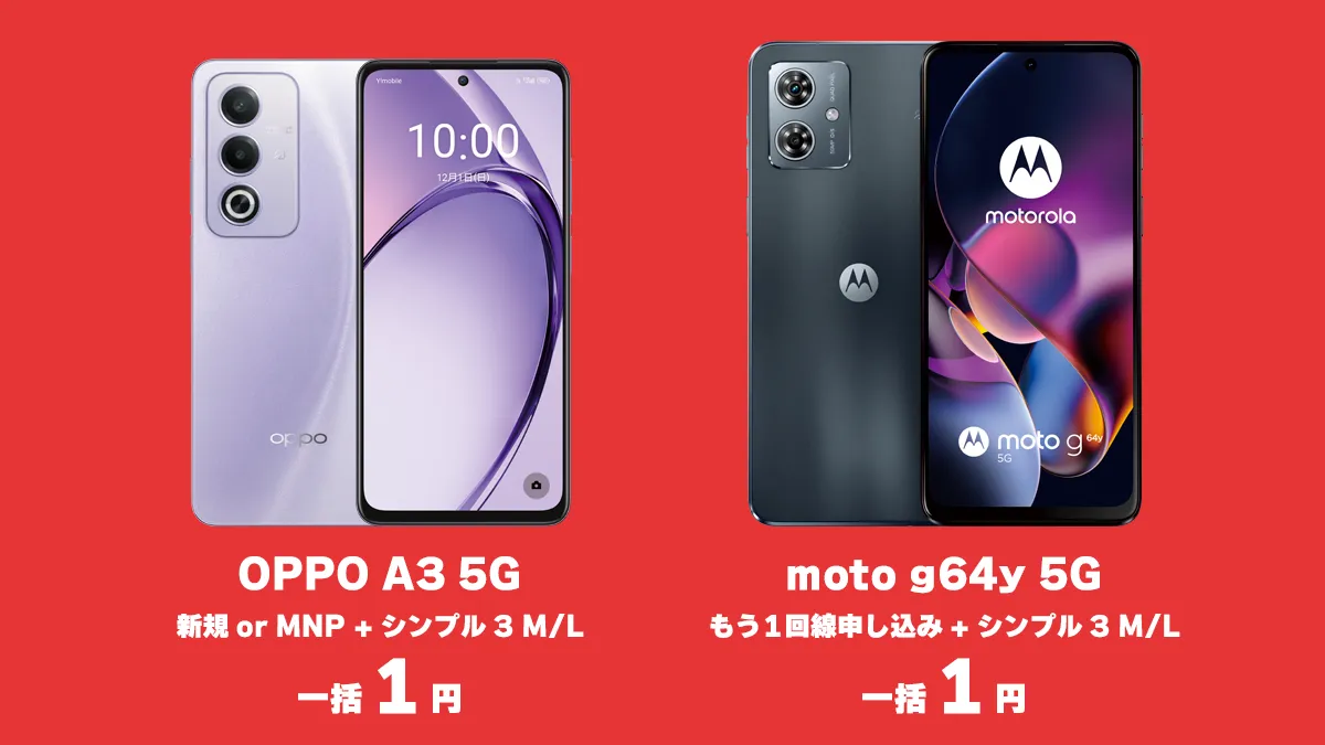 ワイモバイルオンラインストアにてOPPO A3 5Gが一括1円、moto g64y 5Gがもう1回線で1円