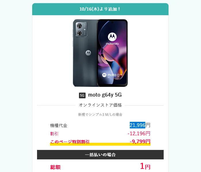 moto g64y 5Gをシンプル3 M/Lの場合は、機種代金が21,996円で通常の割引が-12,196円、さらに今回の特別割引で-9,799円となり、一括総額1円で購入できます。