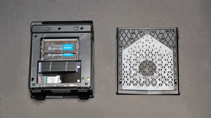 電源ボタンと対面したとき右側に来る面のパネルは、磁石でひっついているだけなので、工具不要で簡単に取り外すことができます。このパネルの下にメモリやSSDがあり、交換が容易に行える構造になっています。
