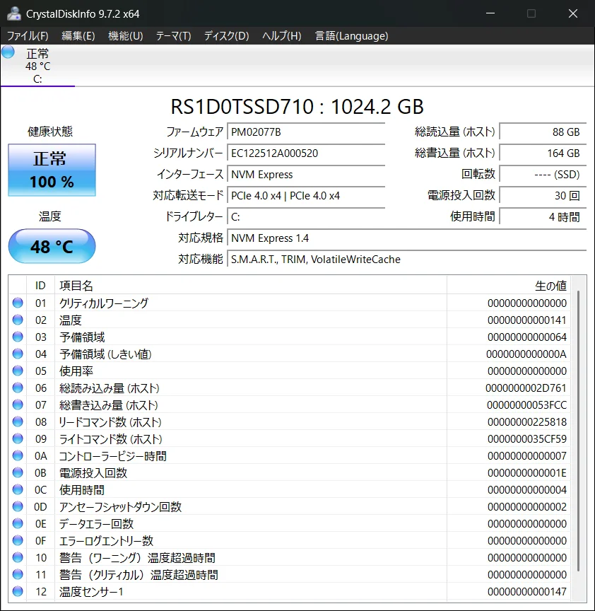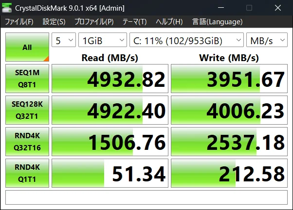 結果はシーケンシャルリードが4932 MB/s、シーケンシャルライトが3951 MB/sとなりました。PCIe 4.0×4のSSDらしい速度になっていますね。