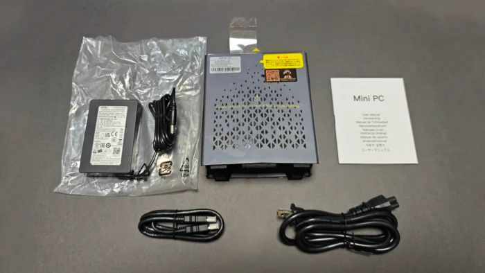 内容物一覧です。ACEMAGIC S3A本体、ACアダプター、ユーザーマニュアル、HDMIケーブルが入っていました。