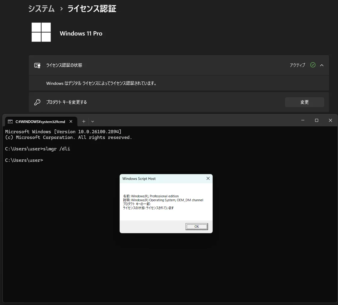 一部のミニPCではOSのライセンスがボリュームライセンスになっている場合があると言われるので、念の為Windowsのライセンスを「slmgr /dli」コマンドで確認してみました。結果は上記画像の通りで、しっかりOEMライセンスで問題ありませんでした。