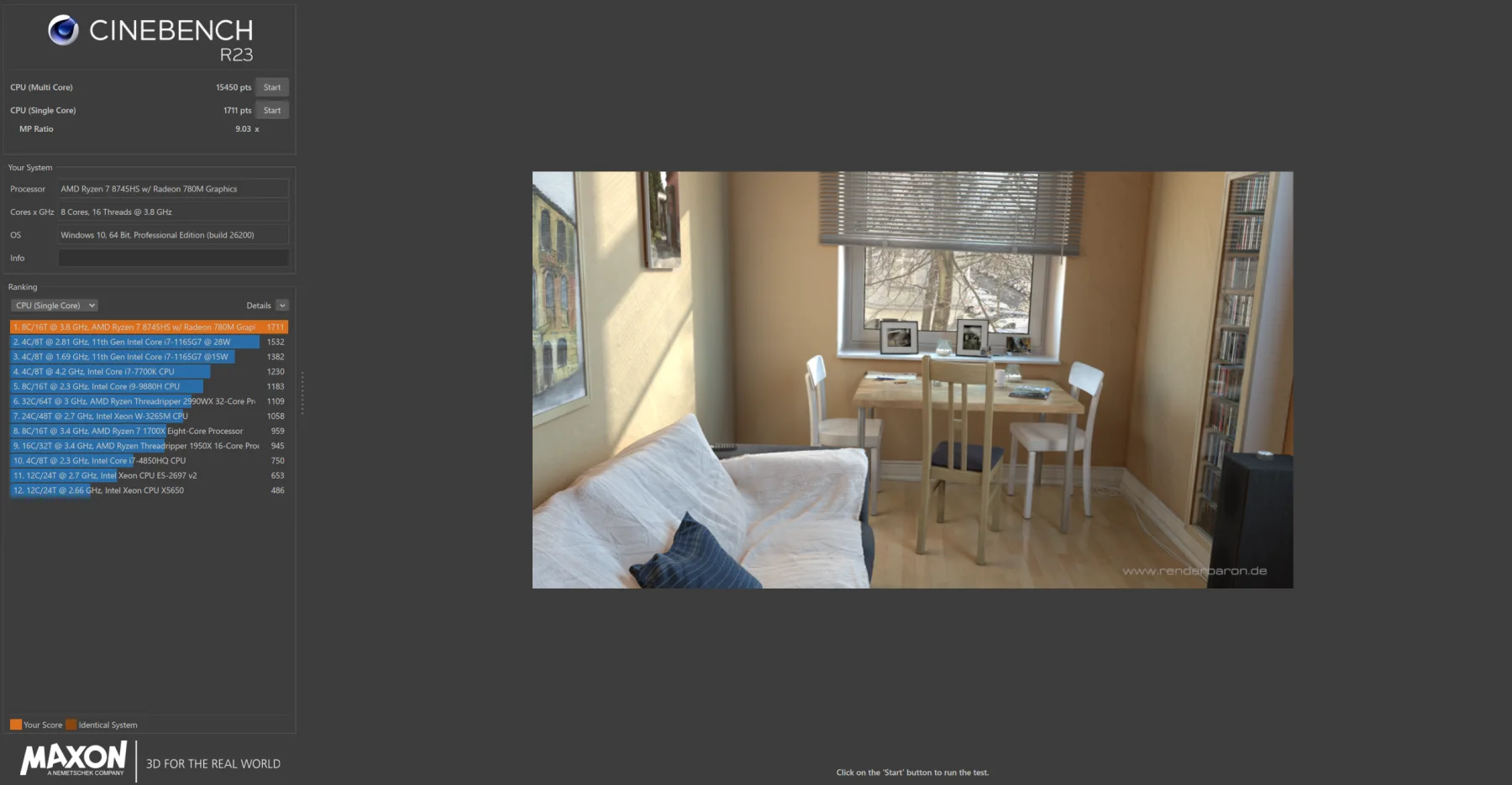 CINEBENCH R23のスコアはマルチコアが15450、シングルコアが1711でした。私がメインで使っている自作PCのCPU(Ryzen 5 3600、6コア12スレッド)がマルチコアで7585、シングルで1143というスコアなので、それよりも格段に性能が高いことになります。マルチコアでは倍近いスコアを記録しています。