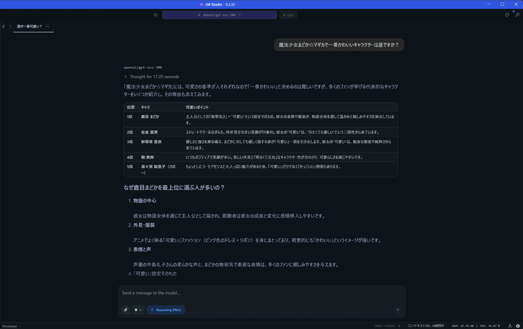 以前LLMをレビューで動かしたときから時間が経ち、モデル自体もローカルで動作させることを前提に、少ない計算量で動作させられるように進化しつつあることもあり、全体的にだいぶ動作は高速になっています。gpt-ossは特に負荷を軽くしやすいモデルなので、今回実用的な速度が出ました。実際の応答を見てみると、事実と明らかに異なることを答えており、応答がまともになるようエキスパート数を増やした(より多くのモデルを使った)ところ、生成速度は1/10程度にまで低下しました。知識が必要な応答はまだまだ負荷がかかってしまうのかもしれません。