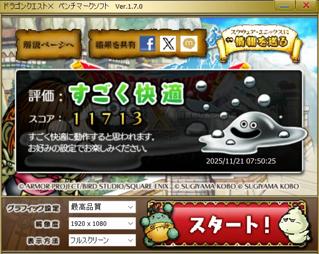 ドラゴンクエストXのベンチマークは、フルHDの最高品質、フルスクリーンで11713のスコア。「すごく快適」の評価でした。今となっては軽めの部類のゲームなので、余裕でプレイできますね。