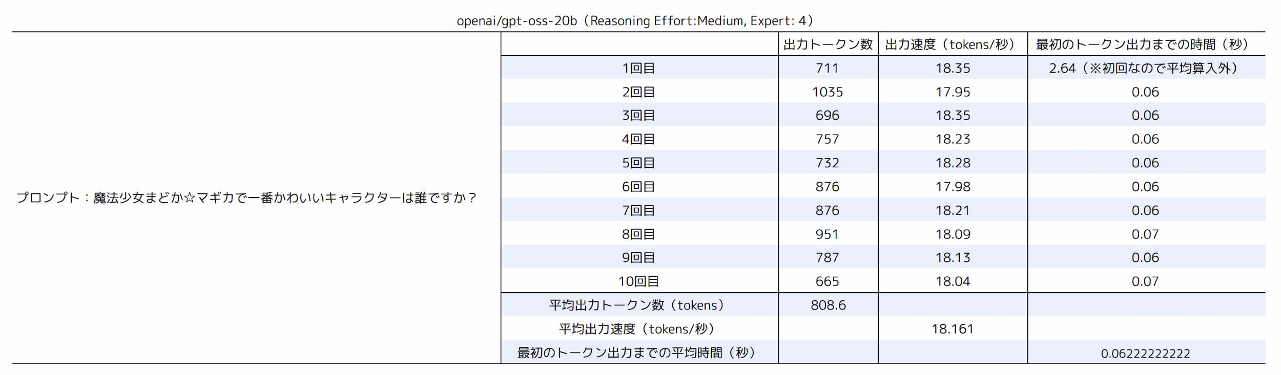 AIモデルにopenai/gpt-oss-20bを用いて全く同じプロンプト(指示文)を10回入力し、AIの回答速度の平均を出してみました。エキスパート数は4、最大トークン数は4096トークンにしています。その結果が以下です。