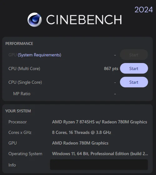 Zen 4アーキテクチャのRyzen 7 8745HSを搭載した本機。なんとなく高性能なことは分かるかもしれませんが、具体的な性能を知るために定番のベンチマークを行いました。結果は以下の通りです。