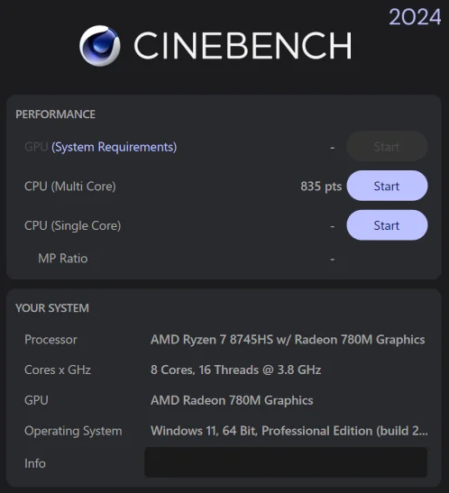 | CPU | AMD Ryzen 7 8745HS / Ryzen 7 8845HS(8コア16スレッド) |