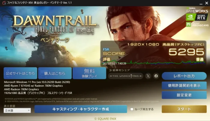 ファイナルファンタジーXIV: 黄金のレガシーのベンチマークは、フルHDのデスクトップPC向け高品質、フルスクリーンモードで計測しました。その結果、スコアは5295で、「普通」の評価でした。このゲームはCPU内蔵グラフィックスには重いゲームですので、健闘したほうではないかと思います。