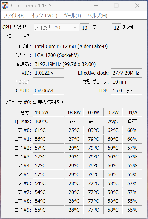 | CPU | Core i5-1235U (P 2コア/ E 8コア) |