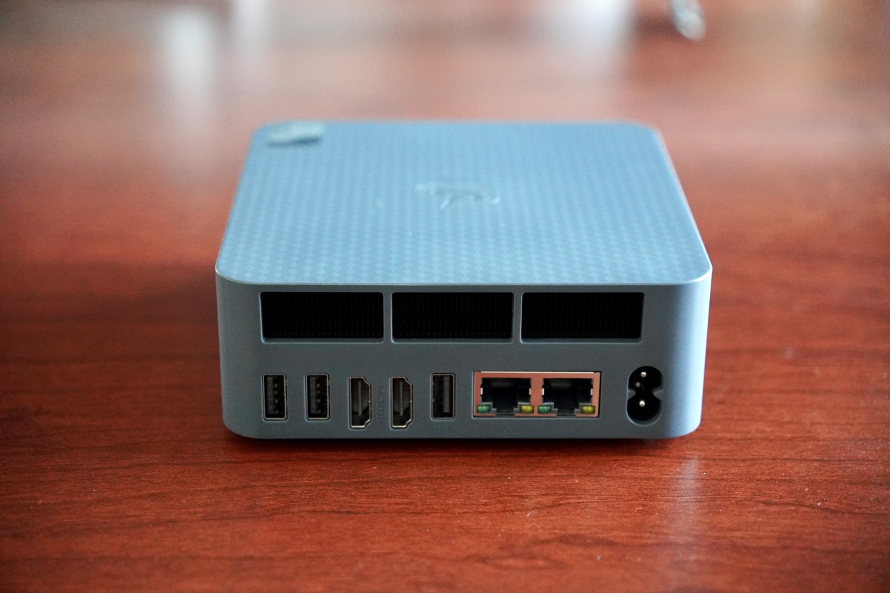 外観は、青みがかったグレーのカラーリングで、天板上部にはBeelinkのロゴがプリントされたシンプルなデザインです。樹脂製のため高級感はありませんが、つなぎ目は限りなく減らされており、シンプルで好感の持てるデザインです。