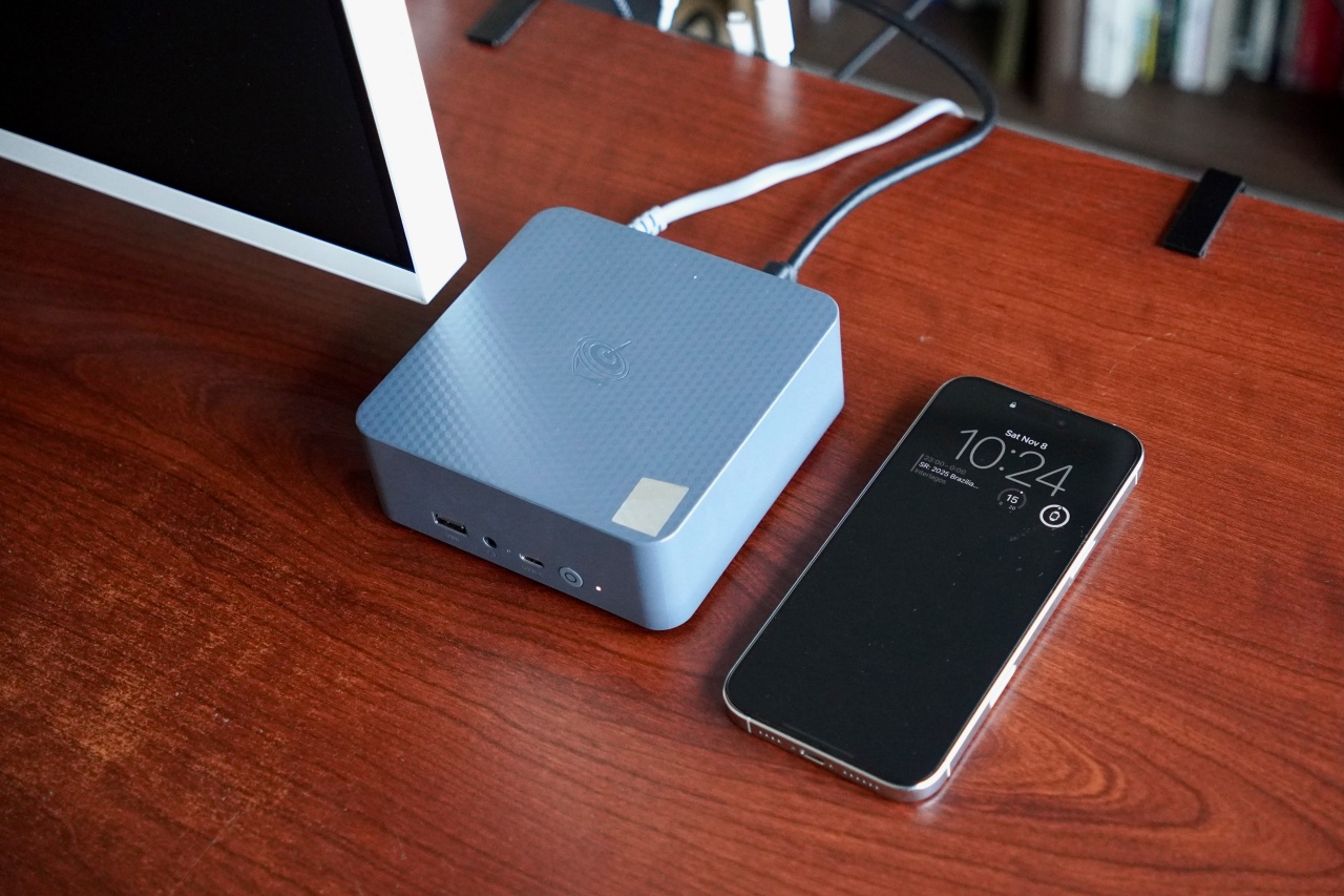 Beelink EQi12と6.9インチのiPhone 16 Pro Maxを並べるとこんな感じ。非常にコンパクトなサイズであることがわかります。