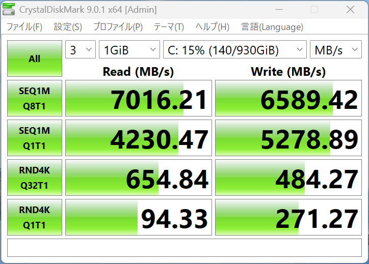 SSDは、CrucialのPCIe 4.0接続の1TBのものを搭載しています。シーケンシャルリードは7016.21MB/s、シーケンシャルライドとは6589.42MB/sと、非常に高速です。
