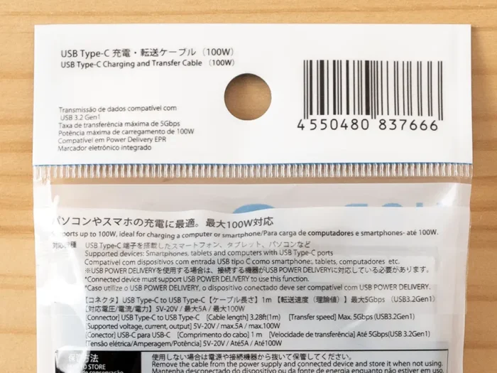 もう片方の紫の方はUSB 3.2 Gen2(最大10Gbps)で最大240Wと書かれています。つまり、前回のケーブルのeMarkerに書き込まれていた情報通りのものです。ただし価格は550円になっています。