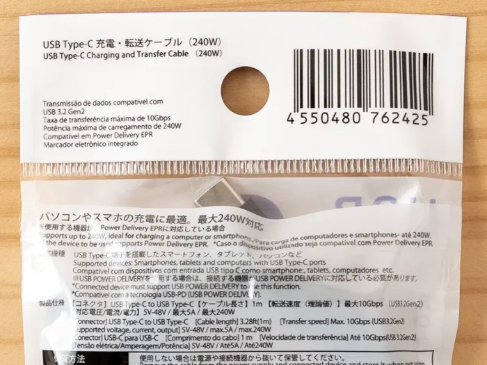 よく見るとコネクタ部分に「100W」「240W」と書かれています。これなら区別がついてわかりやすいですね。両端どちらにも書かれています。ただしUSB 3.2 Gen1/Gen2の表記はありません。